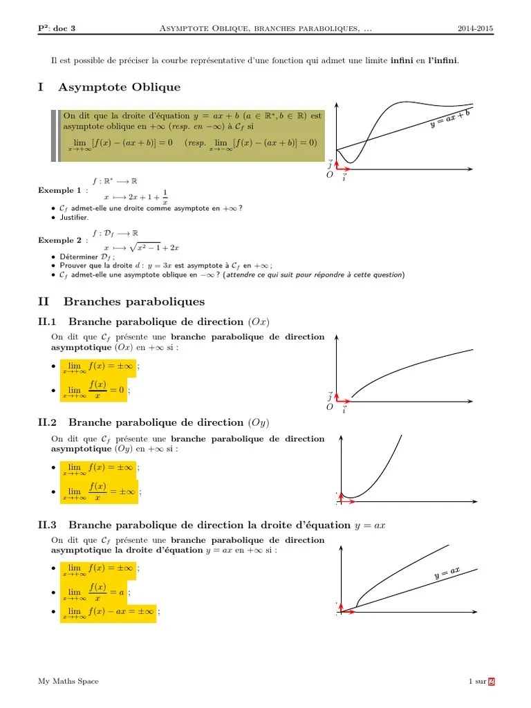 · si mais , la courbe admet une branche infinie parabolique de direction asymptotique y = ax figure ·. Fonctions du type 1 e exemple : Branche parabolique de direction asymptotique. F ( x) = a (a ≠ 0) et x→ ∞ x f ( x ) − ax = b alors la si lim x→ ∞ droite d'équation y = ax + b est une asymptote oblique à cf. · si mais , la courbe admet une branche infinie parabolique de direction asymptotique y = ax figure ·. Y ax 0 li lim et lim et m b.p. X x x a f x ax fx fx y ax x (la courbe regarde dans la direction de la droite. · · f n'est ni paire ni impaire.